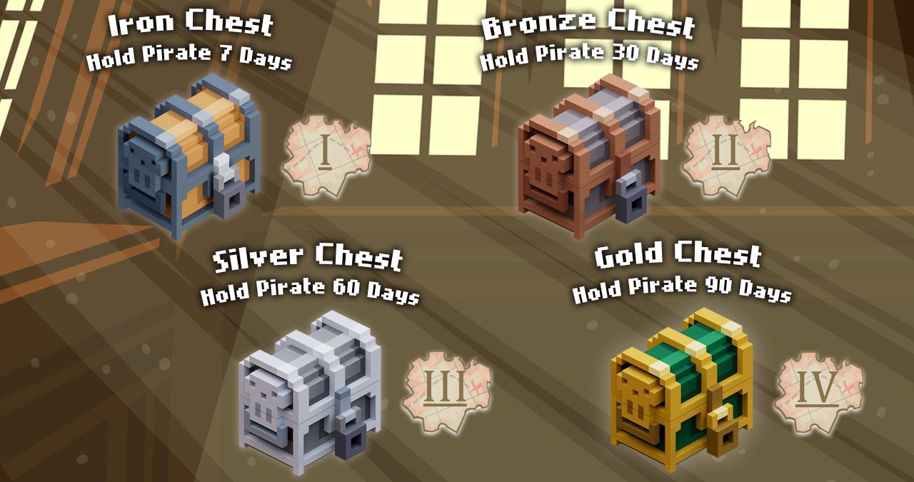 We'll be rewarding players for holding their pirates and playing Pirate Nation by Gold Handing them in-game. Gold Handers will be eligible to claim Founder’s Chests filled with in-game items needed for the adventures on the high seas, plus one Founder's Map Piece per drop period. The chests are an important benefit that allows you to get a head start collecting the resources you’ll need to find yourself atop the leaderboard and on your path towards becoming a feared and renowned Pirate Captain!