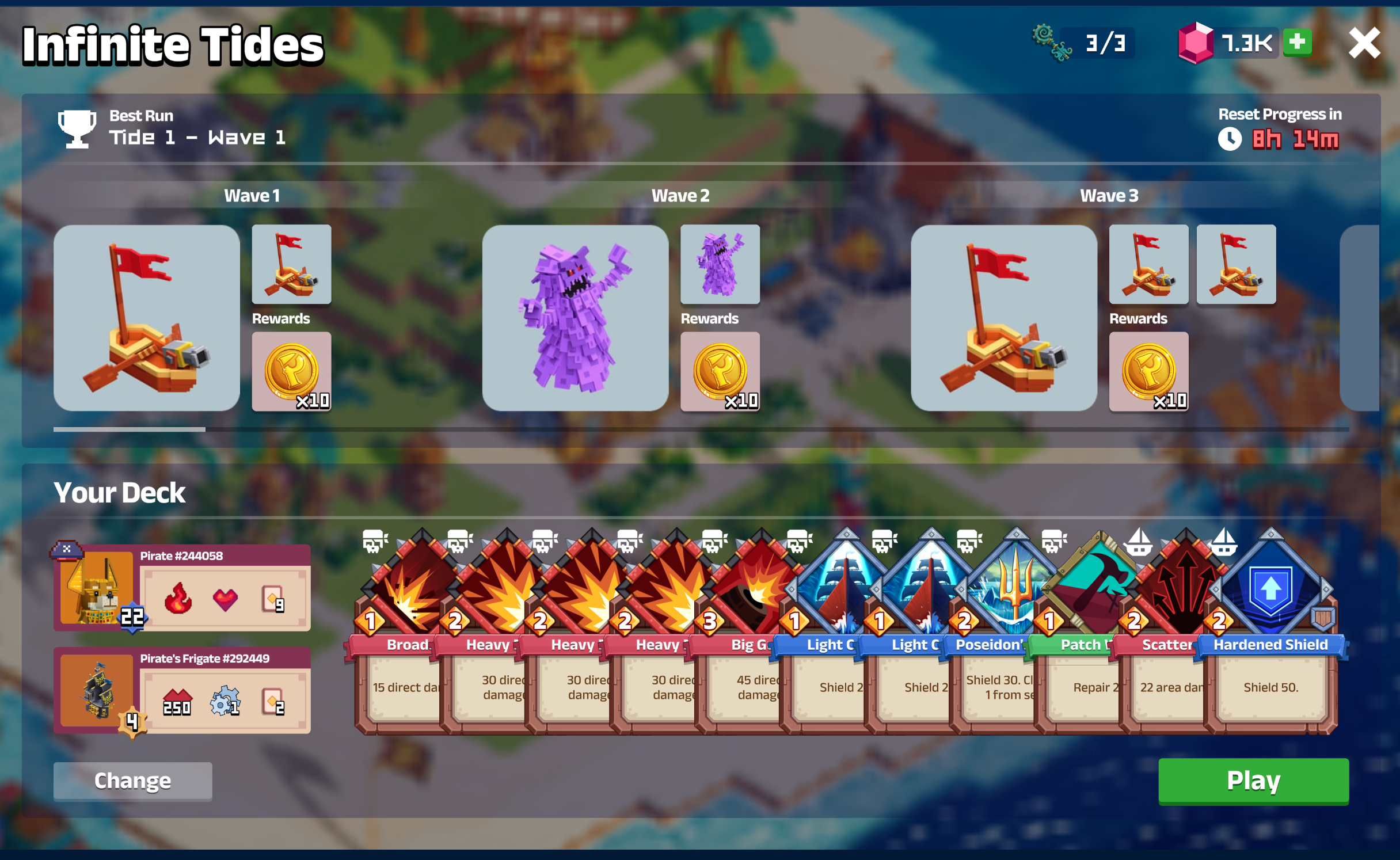You'll start each run on the Infinite Tides with a fixed deck of cards based on your Pirate type & level and your Ship type & level.