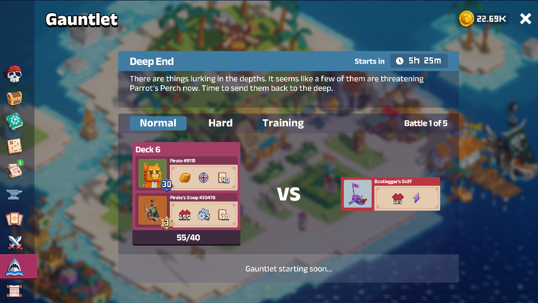 Select your Ship and face off against a series of enemies whose strength and abilities increase with each battle. Your goal is to defeat all of them and claim their loot as Pirate Lord. The Gauntlet has two paths a Pirate can take, Normal and Hard. Hard Gauntlets require an entry fee of 500 Pirate Gold, but the greater the risk, the greater the reward!&#x20;
